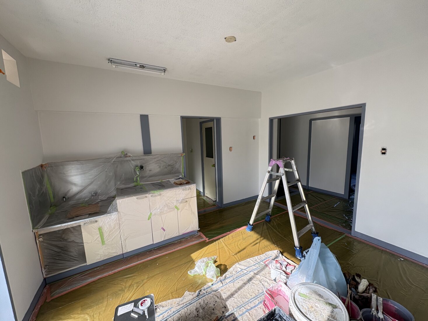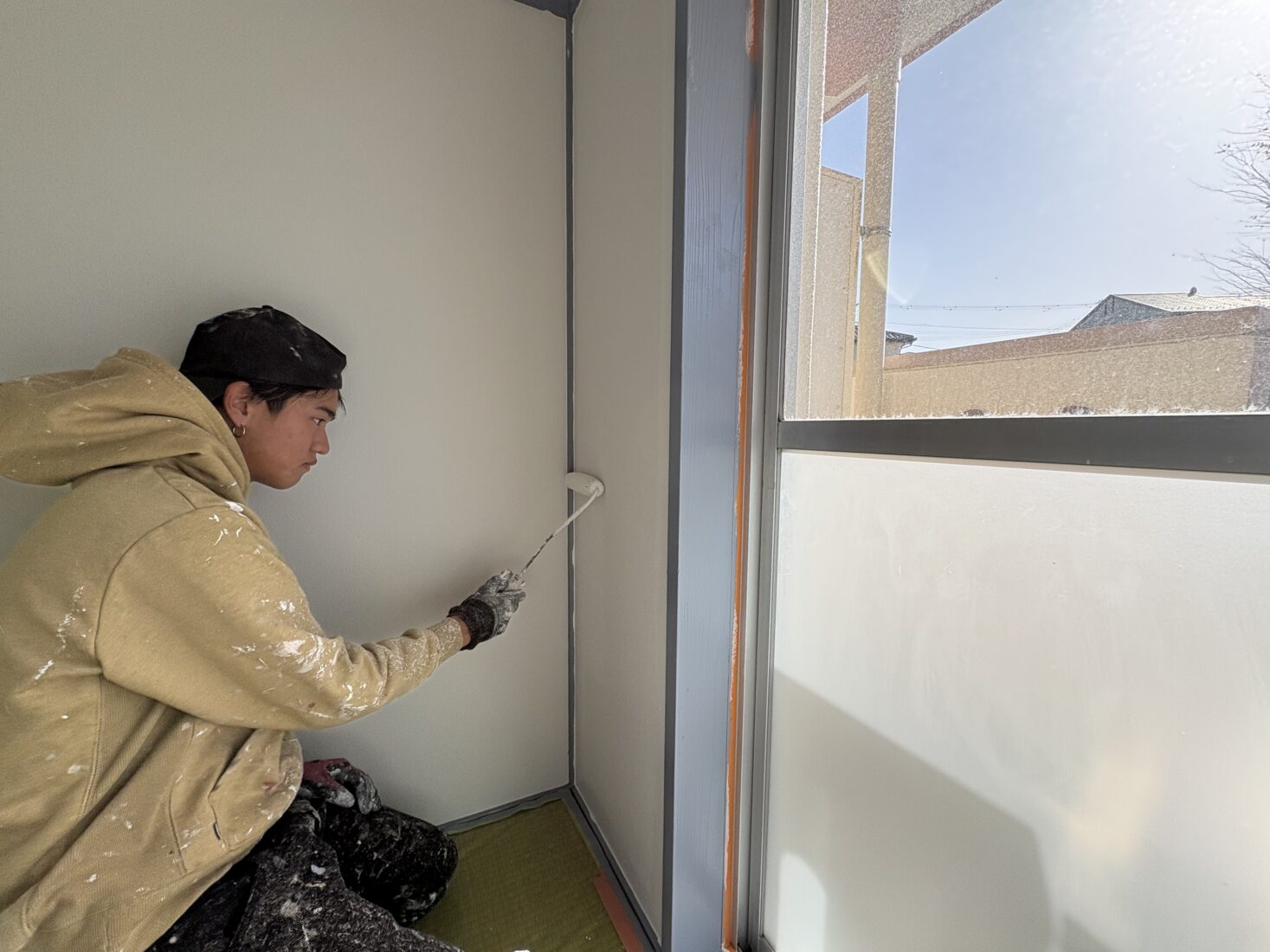 今日は、つくば市内のアパート室内塗装工事現場で、壁の仕上げ作業を行いました。