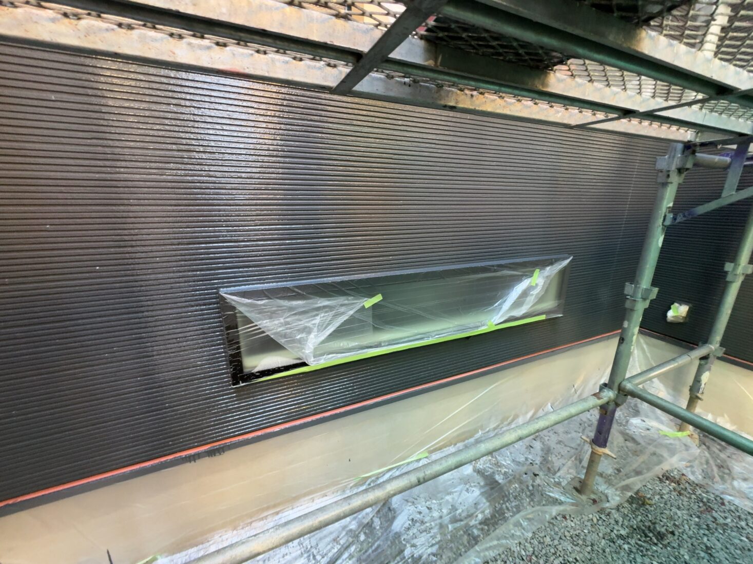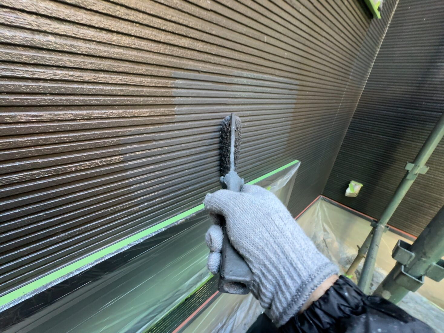 この外壁のタイプは、上塗り1回目で段々になってる中の部分をしっかりと塗ってあげないと、仕上げ作業を行った後塗り残しが出やすいので、気を遣ってしっかりと塗るよう心がけています。