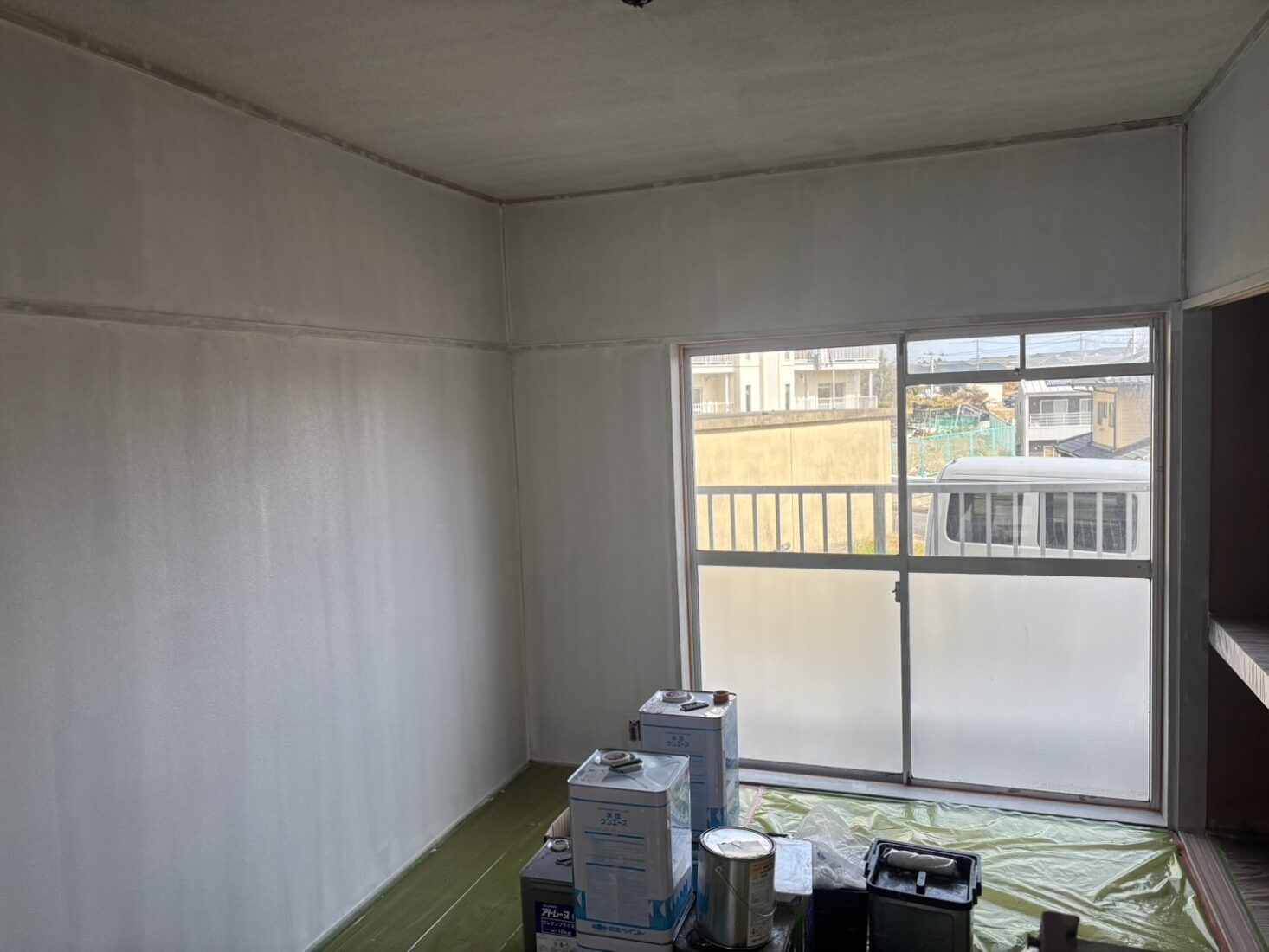 今日は、つくば市の市営アパート室内塗装工事現場で、天井・壁の下塗り作業を行いました。