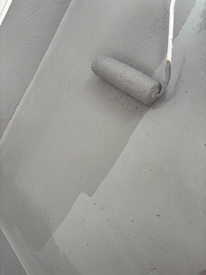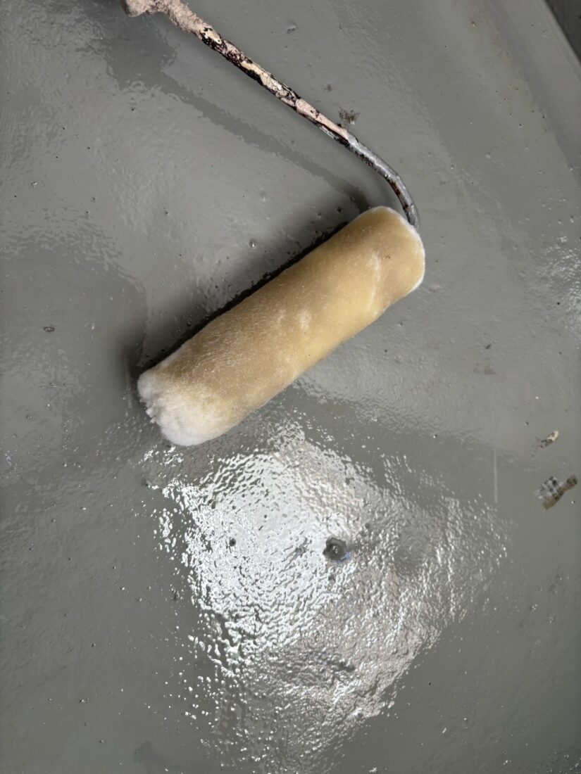 お風呂場床の防水塗装施工中をご覧ください。(↓)