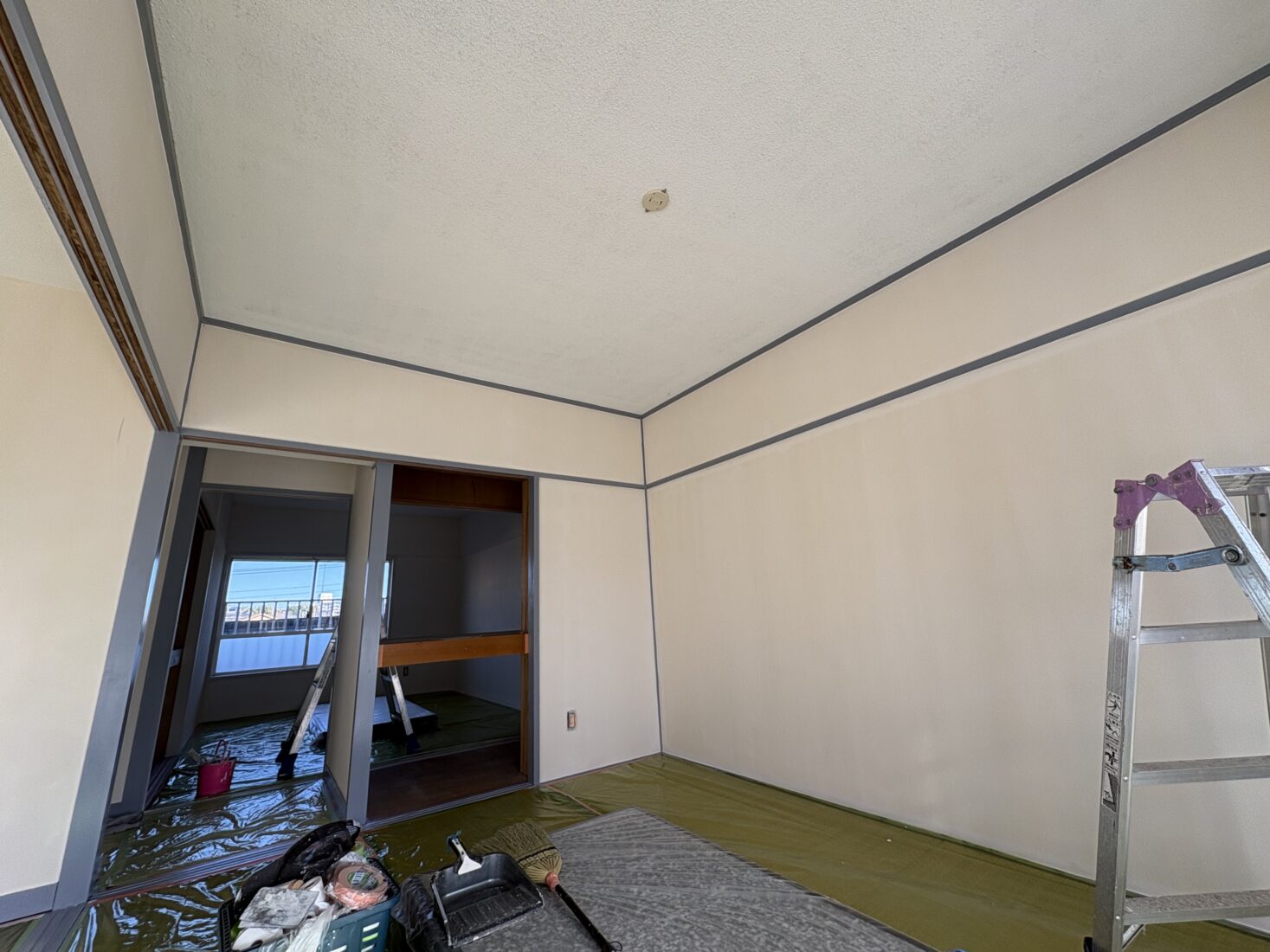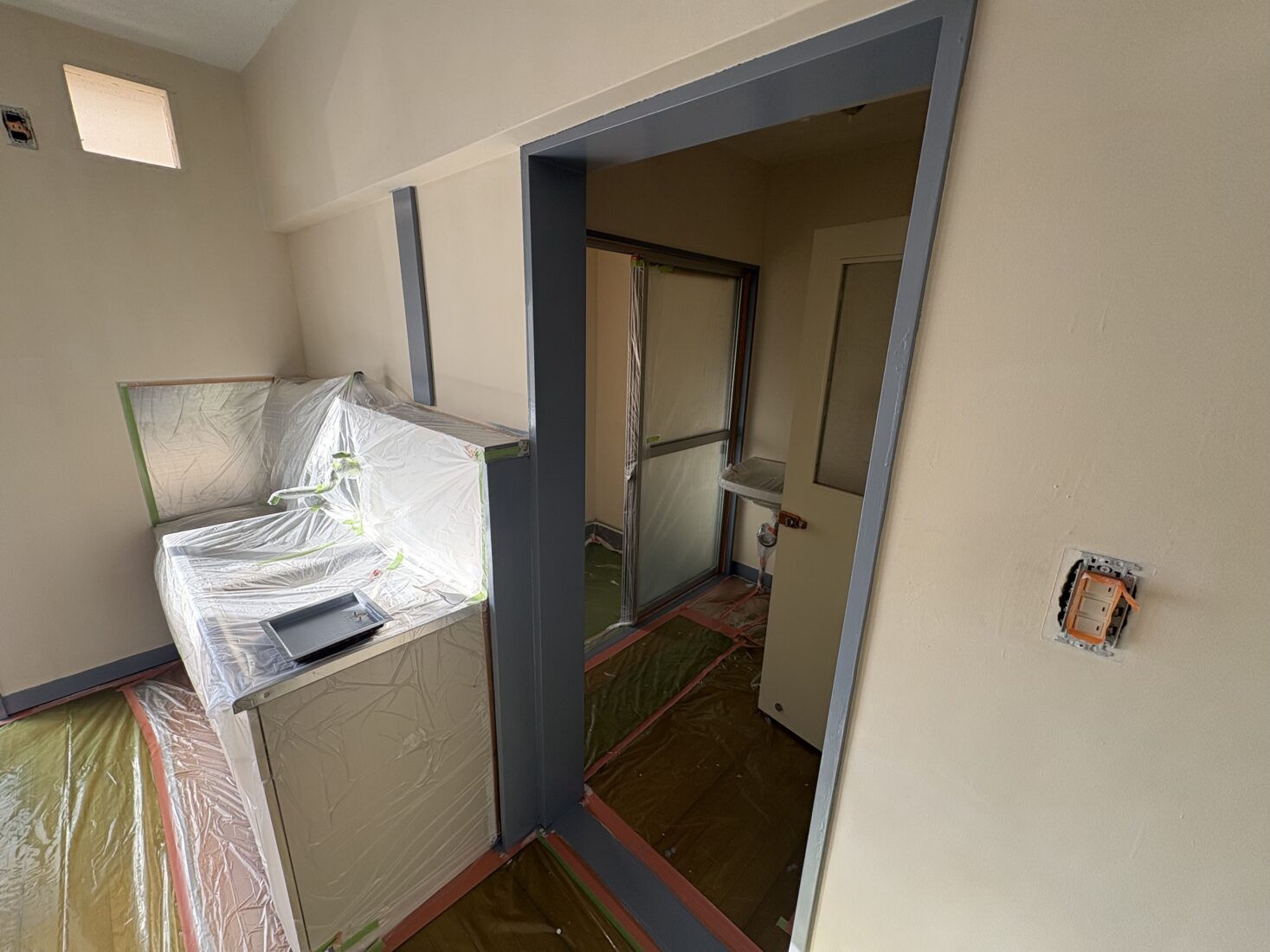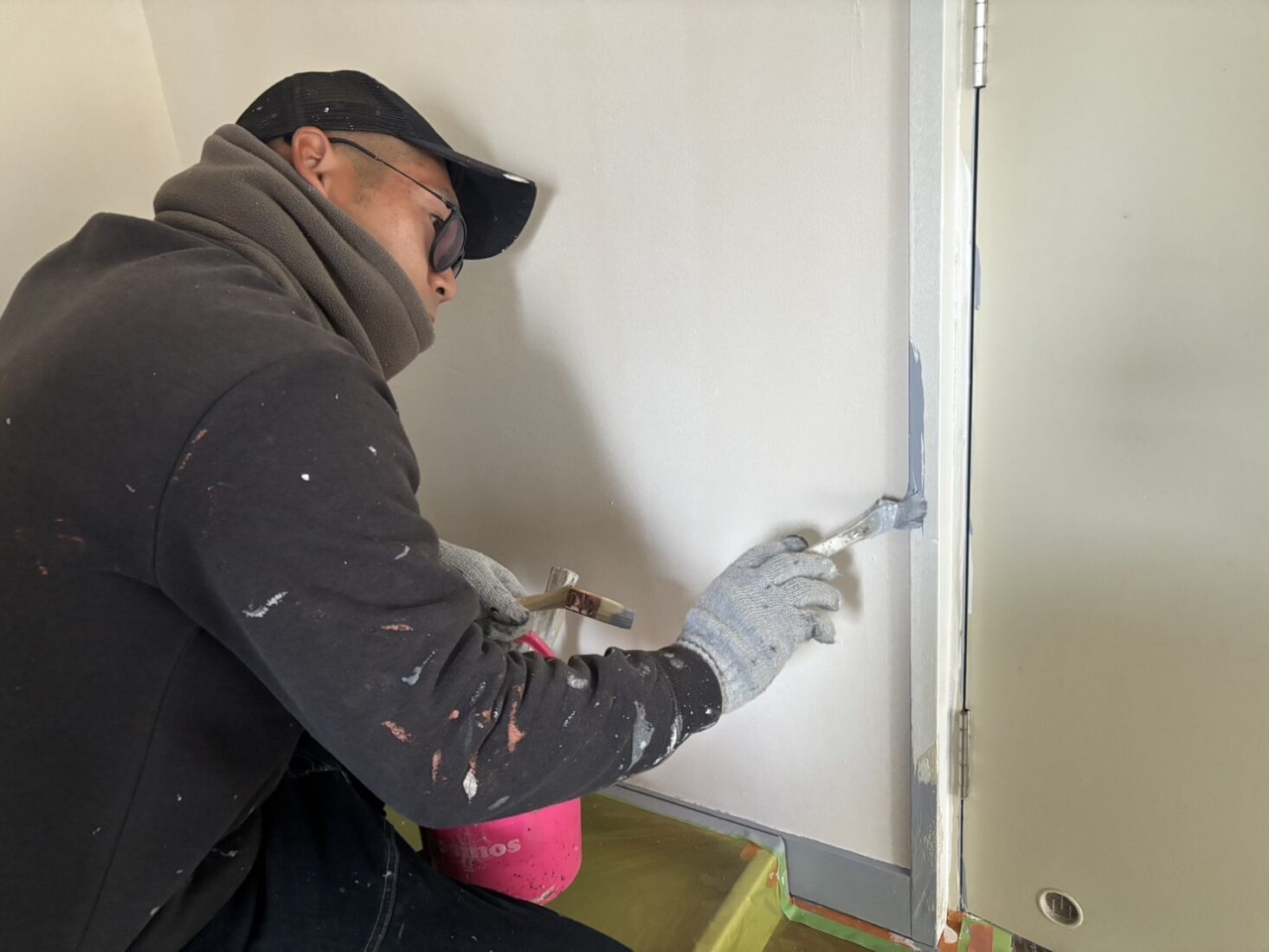 今日は、つくば市内の室内塗装工事現場で、木枠上塗り1回目作業を行いました。
