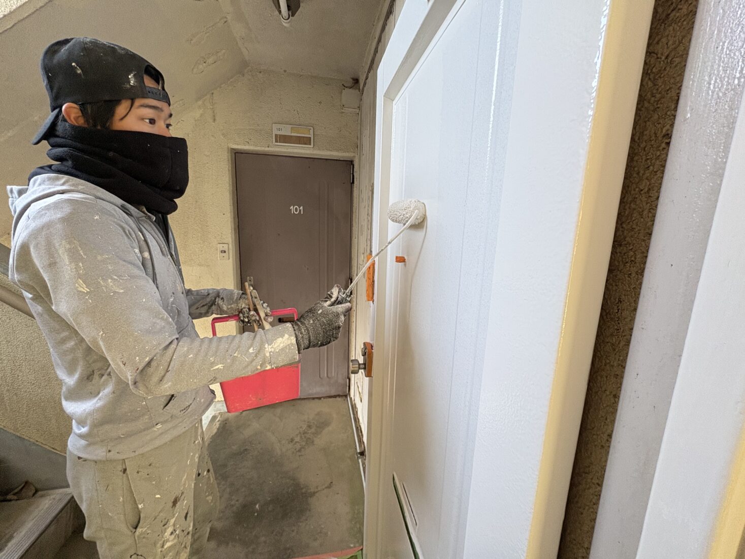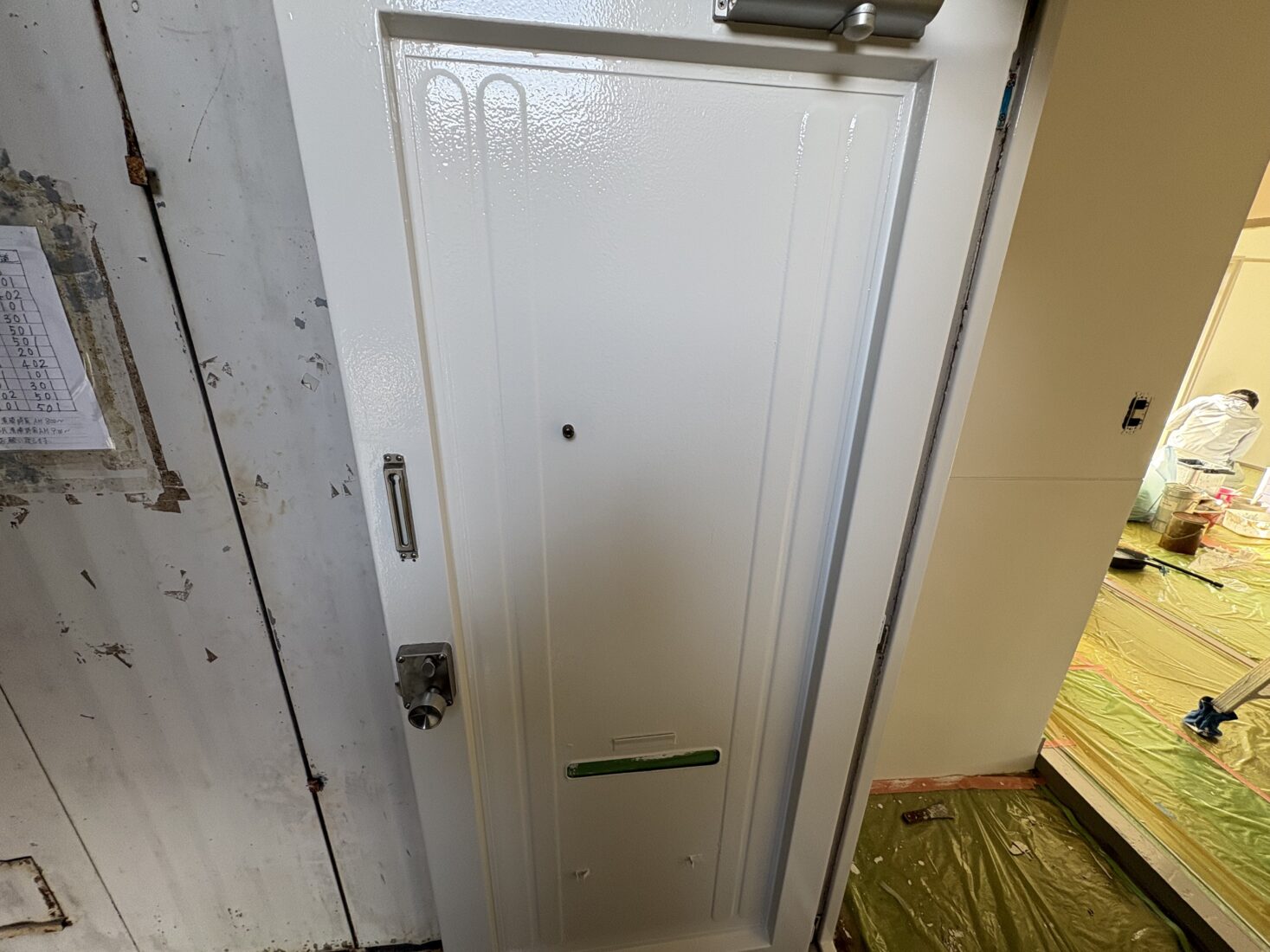 今日は、つくば市内の市営アパート室内塗装工事現場で、玄関ドアの仕上げ塗装、清掃作業を行いました。