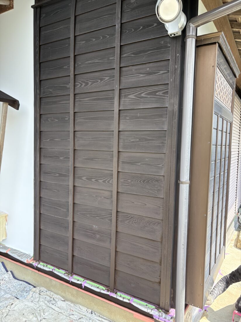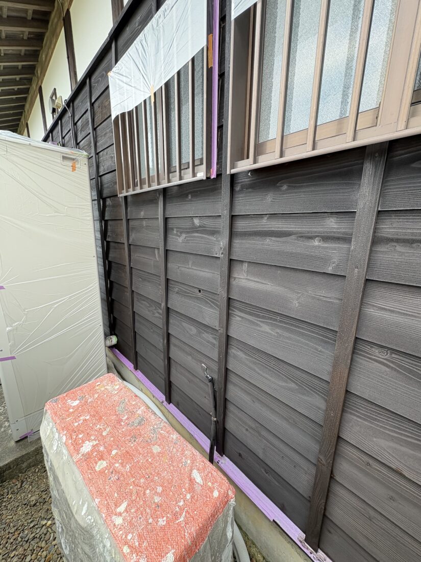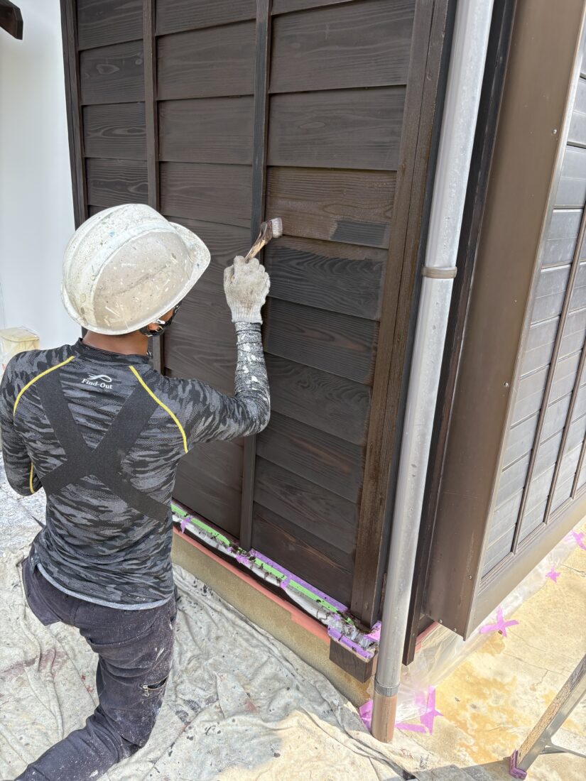 今日はつくば市内で外壁塗装、塀塗装(木部)の上塗り1回目(DAY2)と上塗り2回目を行いました。