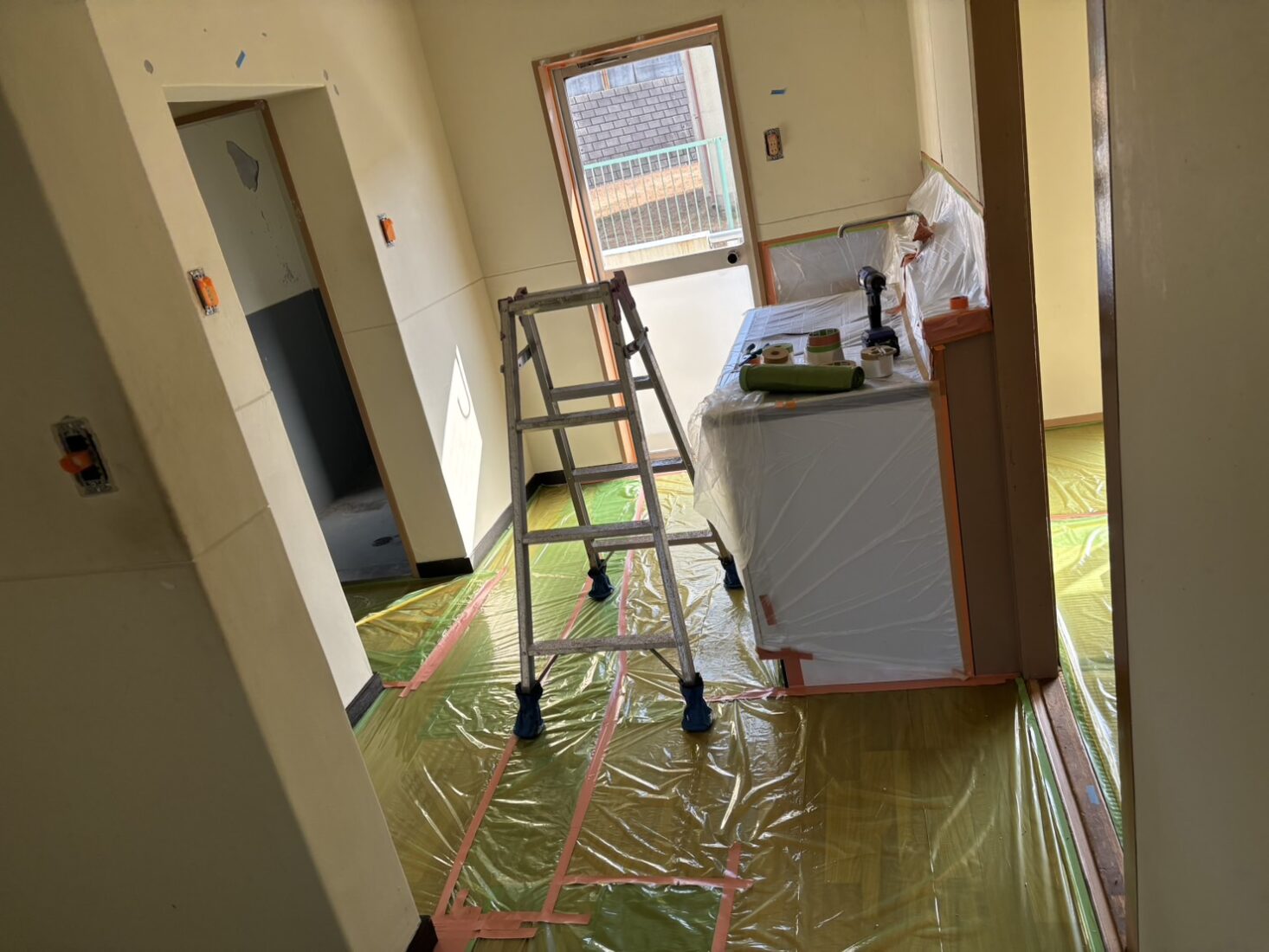 今日は、築50年のつくば市アパート室内塗装工事現場で、養生作業を行いました。