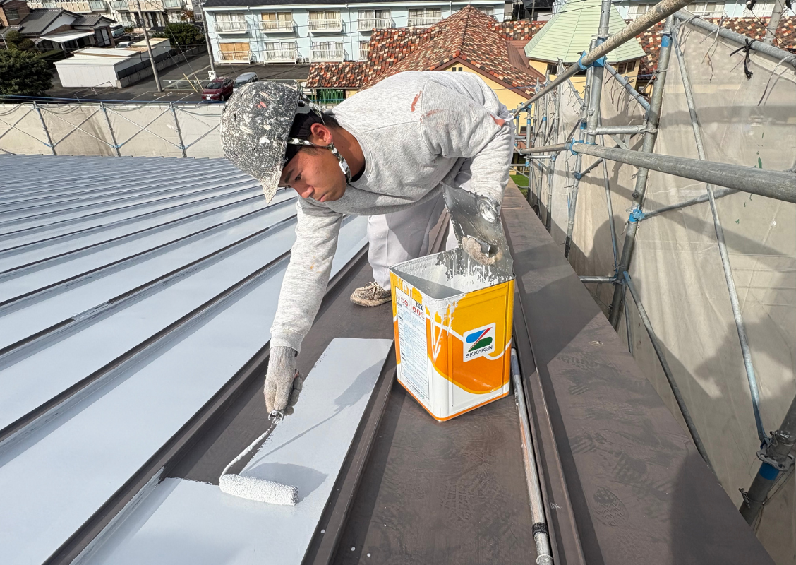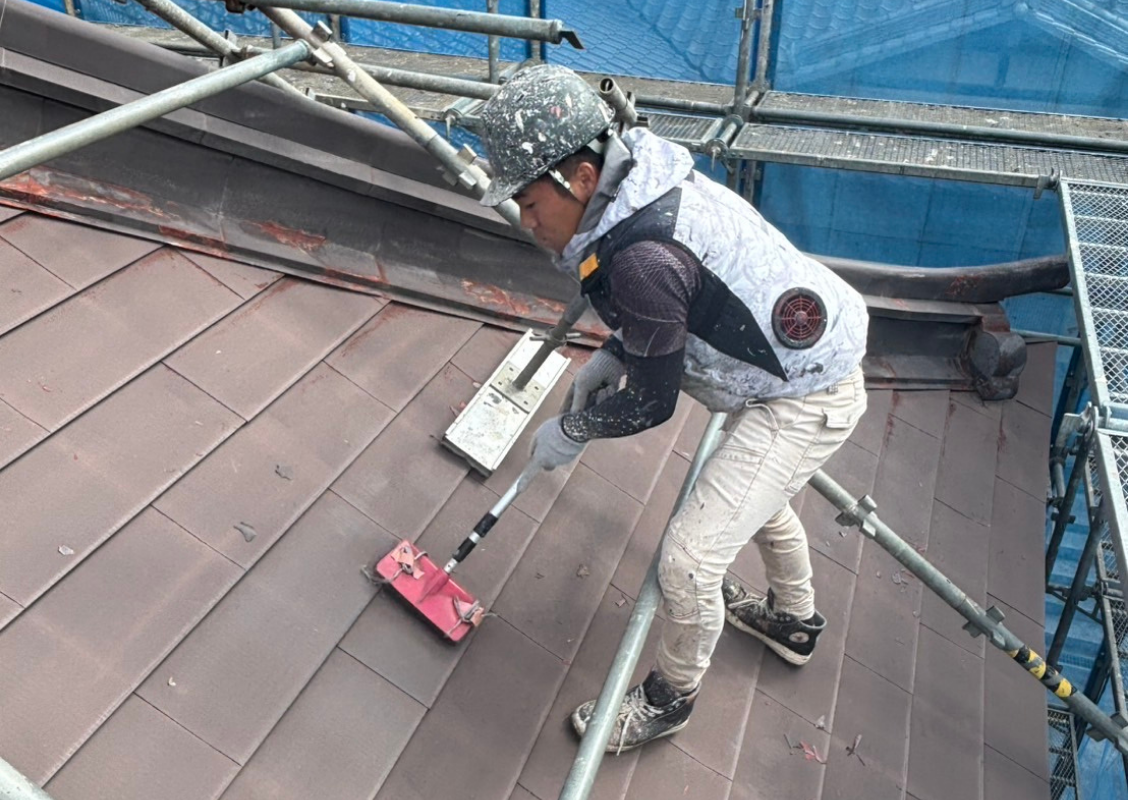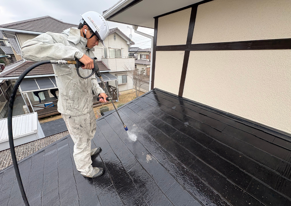 高圧洗浄では、屋根についてしまったコケやカビ、汚れ、前回塗装の塗膜等の不純物などを取り除きます。そうすることで、塗装面が剥がれにくくなります。
